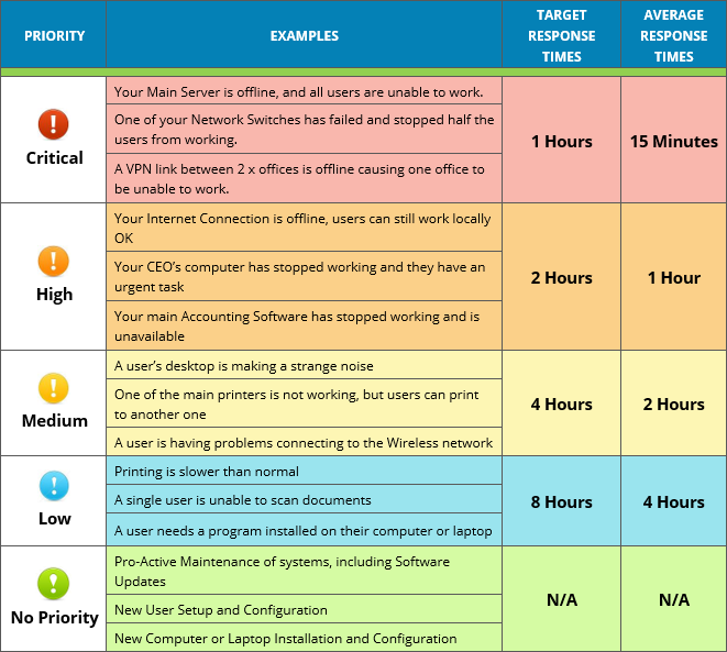Services will be provided remotely unless, at our discretion, we determine that an onsite visit is required. Onsite visits will be scheduled in accordance with the priority assigned to the issue (below) and are subject to technician availability. Unless we agree otherwise, all onsite Services will be provided at Client’s primary office location listed in the Quote. Additional fees may apply for onsite visits: Please review the Service Level section below for more details.